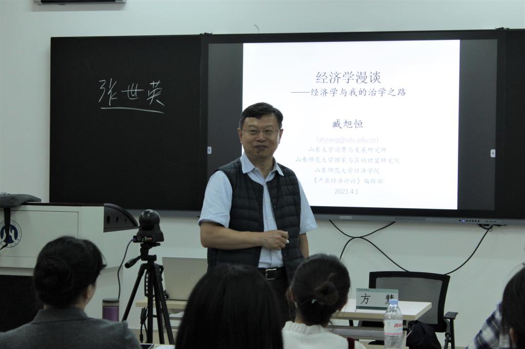 臧旭恒结合自身学习生活经历,介绍了与经济学的渊源。紧接着,臧旭恒建议同学们从以下几个方面入手,提升个人的学术素养。一是攻破中文英文两道关卡。在日常学习生活中给自己的中文写作练习定好目标,如一周写一篇5000字的主题论文等。在英语方面,要抓住练习口语的机会,不要学“哑巴式”英语。其次要注意英语写作的表达方式,切忌中式英语表达。二是重视数理课程的学习。经济学与数学是相辅相成的,经济学知识越前沿,数学知识越前沿。想要在经济学领域有所成绩,数学是必不可少的。三是重视理论基础。同学们需要在学习专业课知识的同时,拓宽知识面和阅读量。