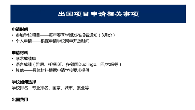 本次讲座先后围绕学生出国项目类型、出国项目申请相关事项、“山财大学生出国访学、攻读学位本科、国际硕士项目介绍”三方面展开。首先,宋老师用专业视角向我们展示了出国项目类型,她重点指出国内中外合作高校、港澳办学项目,也是在疫情影响下留学的不错选择。其次,宋老师强调,对于有出国留学意愿的学生来讲,要尽早明确出国留学所需的相关事宜。然后,宋老师用详尽的图文素材向同学们展示了我校最新国际交流项目,专业详实的介绍使得同学们对国外大学申请有了初步了解。最后,宋老师就出国项目的个人筛选提供了专业建议,并结合自身留学经历给大家未来生涯规划展示了多样化的选择,对同学们的个人发展具有重要指导意义。