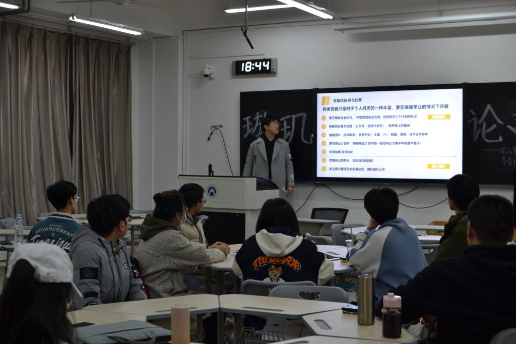 活动伊始,智慧耘团队创始人苏奎安同学介绍了智慧耘项目团队的发展,然后分别从自我组队和加入团队两方面出发分享参加比赛的经验并结合自身答辩经历向同学们传授答辩小技巧;此外,项目团队的现任队长张瑾同学为同学们详细介绍了“互联网+”和挑战杯比赛的评审要点,然后具体介绍了项目孵化的准备工作,她指出参加比赛要做好迎接挑战的准备,同时做项目打比赛要将眼光放长远,不能仅仅拘泥于个人的综测加分。